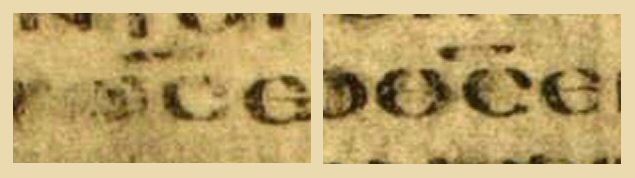 Reproduced below is the text of 1 Timothy 3:16–4:3 from Codex A, as presented in the photographic facsimile volume published by the British Museum in 1879. Of particular interest here is the reading in 3:16, where it may be seen that the manuscript reads ΘC “God was manifested in the flesh,” employing the usual abbreviation ΘC for ΘEOC, with a stroke over the letters to indicate an abbreviation. However, textual critics believe that the ink in the center of the Θ and the stroke above were added by a corrector in modern times. Reasons for this belief are the color of the ink, and the fact that a “dot” has been placed in the Θ instead of a line. Tregelles writes, “The ink in which this has been done in A is sufficiently modern and black to declare its recent application” (An Account of the Printed Text of the Greek New Testament, London, 1854). Without these marks, the manuscript originally read ΟC “He who was manifested in the flesh.” In the photograph below the ΘC in 3:16 is circled. Further down, in verse 4:3, there is another ΘC circled for comparison. Click on the circled areas for a larger view.