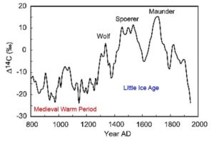 The last major one is the Little Ice Age from 1450. The previous one is termed the Bond Cycle that brought in the Dark Ages and dropped the coastlines by over 7 feet worldwide.