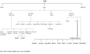Genesis 10:1, 6-20 These are the generations of the sons of Noah, Shem, Ham, and Japheth; sons were born to them after the flood. … 6 The sons of Ham: Cush, Egypt [Mizraim: KJV], Put, and Canaan. 7 The sons of Cush: Seba, Hav’ilah, Sabtah, Ra’amah, and Sab’teca. The sons of Ra’amah: Sheba and Dedan. 8 Cush became the father of Nimrod; he was the first on earth to be a mighty man. 9 He was a mighty hunter before the LORD; therefore it is said, “Like Nimrod a mighty hunter before the LORD.” 10 The beginning of his kingdom was Ba’bel, Erech, and Accad, all of them in the land of Shinar. 11 From that land he went into Assyria, and built Nin’eveh, Reho’both-Ir, Calah, and 12 Resen between Nin’eveh and Calah; that is the great city. 13 Egypt became the father of Ludim, An’amim, Leha’bim, Naph-tu’him, 14 Pathu’sim, Caslu’him (whence came the Philistines), and Caph’torim. 15 Canaan became the father of Sidon his first-born, and Heth, 16 and the Jeb’usites, the Amorites, the Gir’gashites, 17 the Hivites, the Arkites, the Sinites, 18 the Ar’vadites, the Zem’arites, and the Ha’mathites. Afterward the families of the Canaanites spread abroad. 19 And the territory of the Canaanites extended from Sidon, in the direction of Gerar, as far as Gaza, and in the direction of Sodom, Gomor’rah, Admah, and Zeboi’im, as far as Lasha. 20 These are the sons of Ham, by their families, their languages, their lands, and their nations. (RSV)